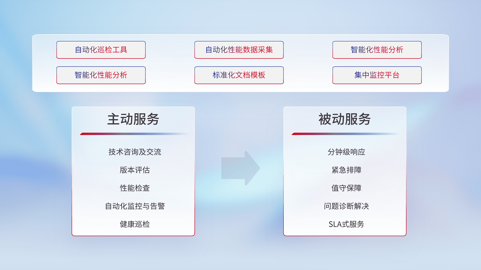 智能化工具和标准化文档,,保障服务质量,,提供主动服务(包含技术咨询、、、版本评估、、性能检查、、自动化监控与告警、、健康巡检)和被动服务包含(分钟级响应、、、紧急排障、、、、值守保障、、、问题诊断解决、、SLA服务)。。。
